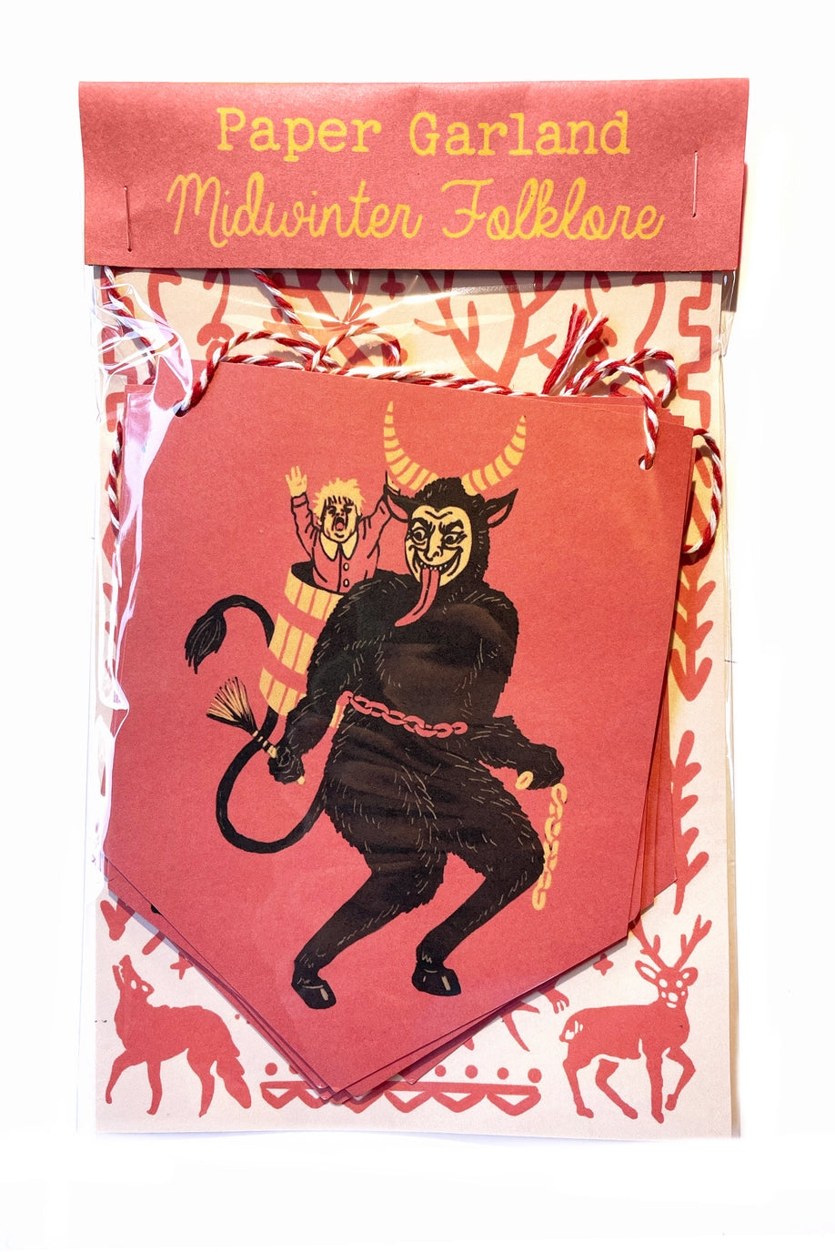When the nights are long and snow covers the land, we find the folk tales of midwinter. This paper garland features eight illustrated folk tales from around the world, from Krampus, Belsnickle and Jólakötturinn, to Mari Lwyd and the Wild Hunt.