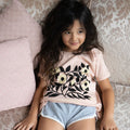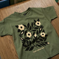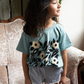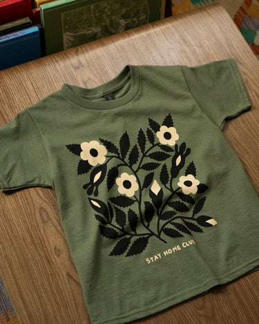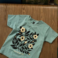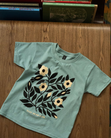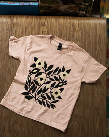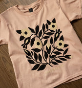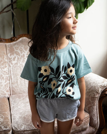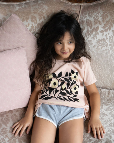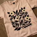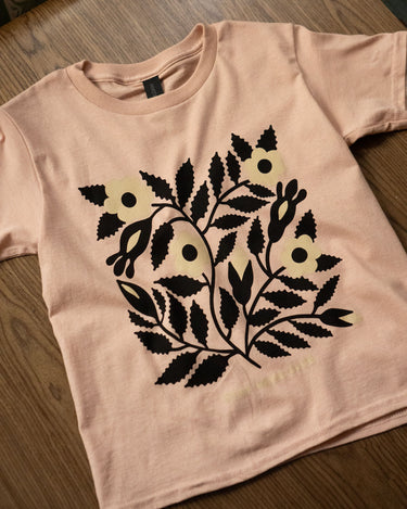 Our "1858" collection is entirely based on our interpretations of an appliquéd quilt top from the 1850s. This floral design has been one of our favourite prints on adult tees, so we threw it on some fun colours for the kiddos!