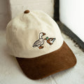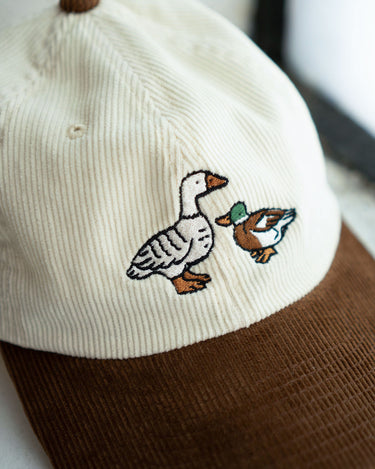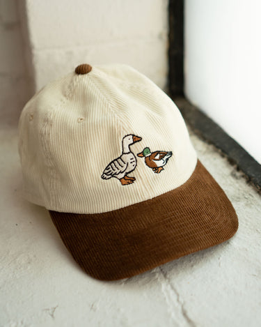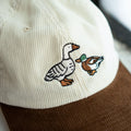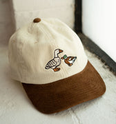 This is a six panel, unstructured, low-profile baseball cap aka dad hat in two ice-cream-inspired tones of lush, velvety corduroy. It has a slightly deeper fit than our standard dad hats and seemingly suits pretty much everyone. Our "Fowl" duck and goose design is embroidered directly into the front of the hat. Fully adjustable using a metal sliding buckle at the back. Unisex fit.