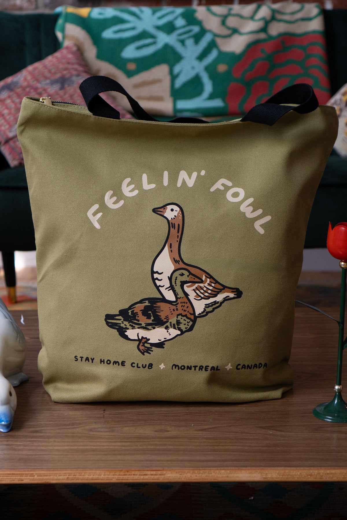Our 'Feelin' Fowl' duck and goose are printed in 3 colours on the front of this olive green tote with black canvas straps.